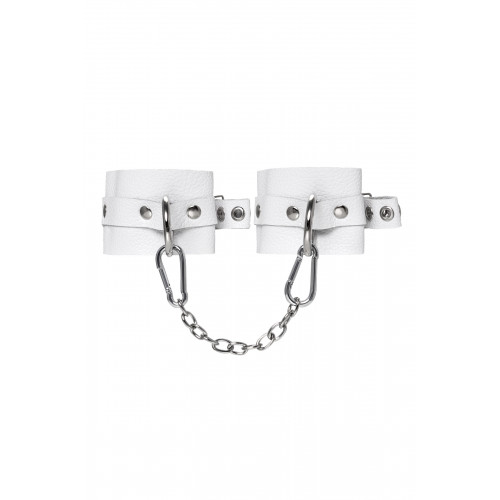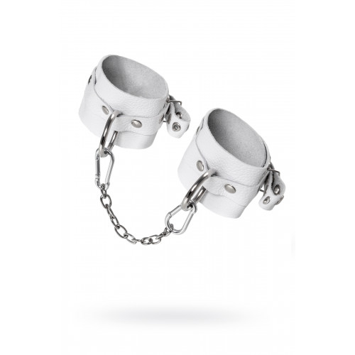 Мягкие наручники. Лаконичный дизайн, насыщенно белый цвет и терпкий аромат материала - повышают градус возбуждения в процессе ролевых игр. Наручники выполнены из экологичной и натуральной кожи. Полностью ручная выделка материала обеспечивает хорошую износостойкость. Каждый миллиметр аксессуара очень тактильно приятный. Манжеты и ремешки не мнутся. При правильном использовании не оставляют следов на запястьях. Благодаря стальной застежке и отверстиям с люверсами можно подобрать нужный обхват. Между собой наручники соединены с помощью карабинов и короткой цепочки. При необходимости ее можно снять и заменить на более длинный вариант. Используется для того, чтобы обездвижить партнера и зафиксировать руки в необходимом положении. Подходит как маститым знатокам БДСМ-культуры, так и начинающим парам. Материал: натуральная кожа. Ручная работа. Износостойкий, тактильно приятный материал. Надежная высококачественная фурнитура. Универсальный размер. Длина манжет 18 см.
