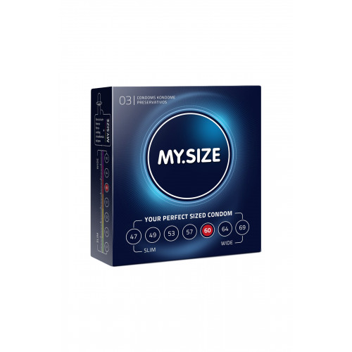Презервативы My.Size 60 рекомендованы для полового члена обхватом от 12,0 до 13,0 см. Презервативы My.Size - это немецкие презервативы премиум класса, которые уникальны своей разнообразной линейкой. Аналогов этим презервативам в мире нет. Особенностью данной марки является разнообразие не в сторону различных фактур, смазок и свойств, а в сторону размеров - длины и ширины. Эти презервативы подойдут как тем, у кого пенис меньше «среднестатистического», так и тем, у кого пенис больше. Другой особенностью данных презервативов является использование смазки на водной основе, которая применяется в большинстве интимных гелей и смазок для добавления естественности ощущениям.