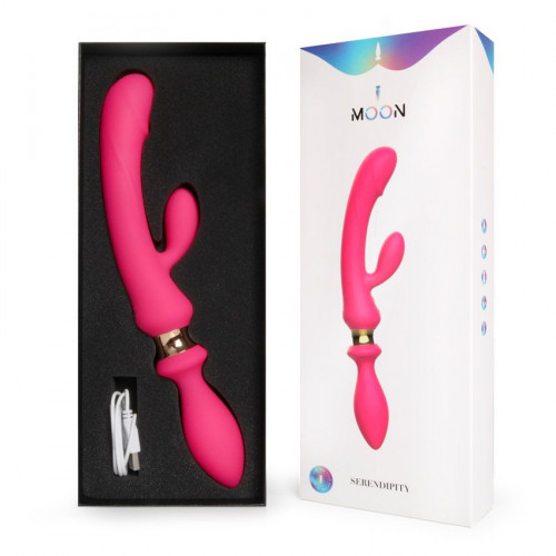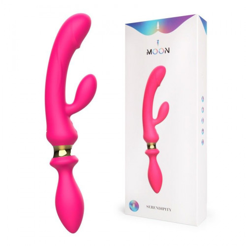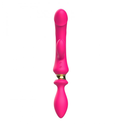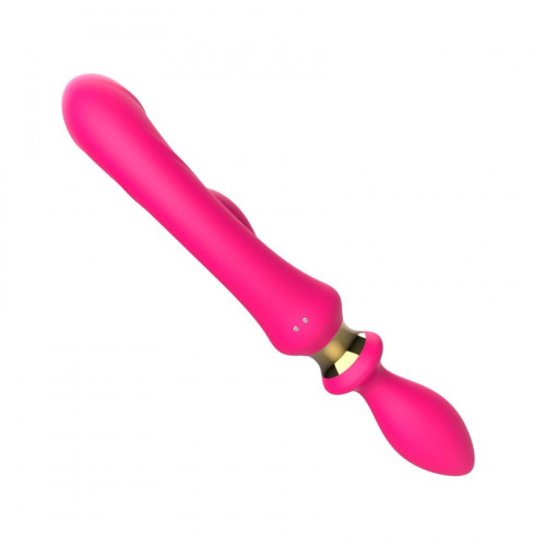 Розовый двусторонний вибромассажёр с клиторальным отростком - 30 см.