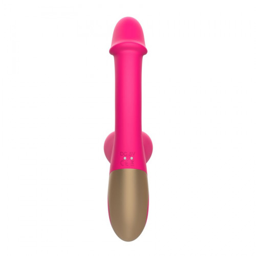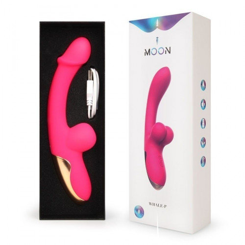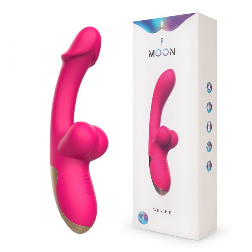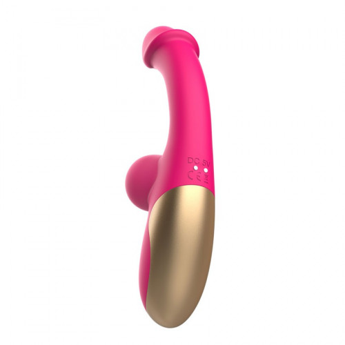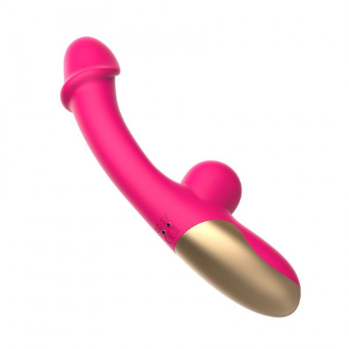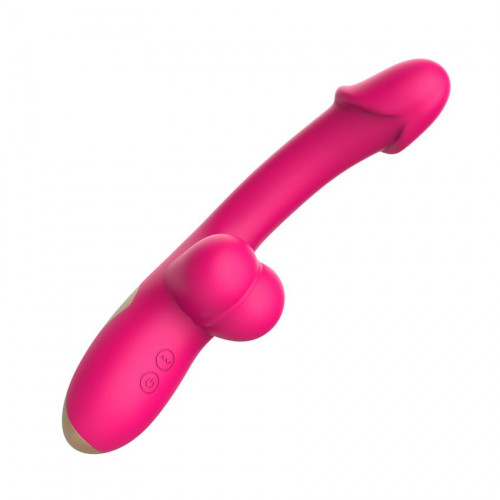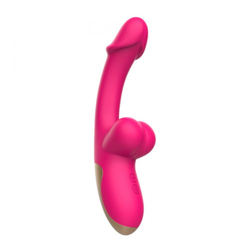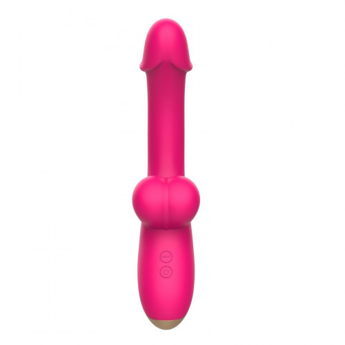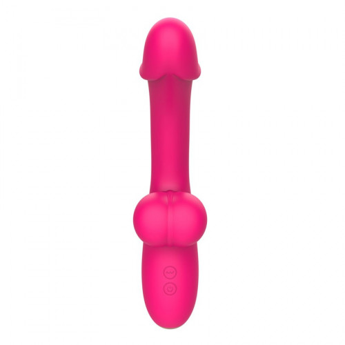 Розовый изогнутый вибромассажёр с имитацией мошонки - 20 4 см.