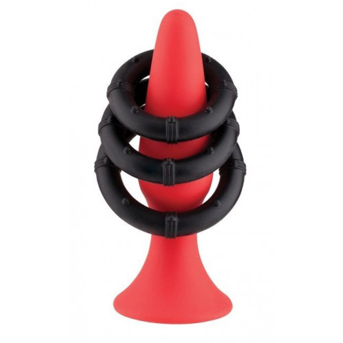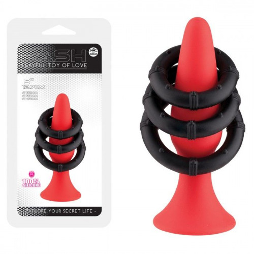 Красный плаг для анальной стимуляции из силикона. В наборе 3 черных силиконовых кольца, которые можно использовать на пенисе и мошонке. Диаметр колец - 3, 3,5 и 4 см.