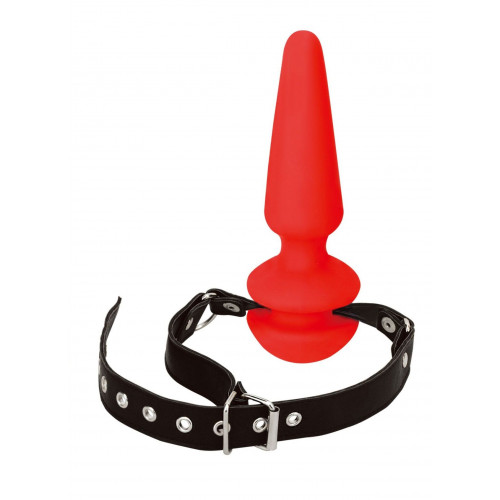 Красный кляп-плаг из силикона на черных регулируемых ремешках