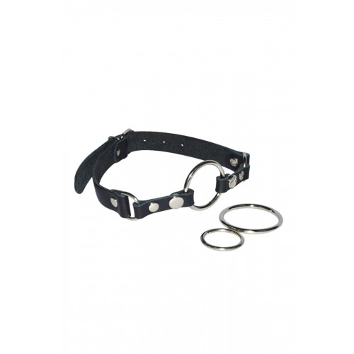 Кляп-рамка изготовлен из натуральной высококачественной кожи чёрного цвета. Особенностью данного девайса, являются сменные кольца, которые легко отстегнуть при помощи кнопок. Внешний диаметр колец: 38 мм, 44 мм, 59 мм. Зафиксировать и отрегулировать изделие можно при помощи металлической пряжки. Вся металлическая фурнитура имеет никелевое покрытие.