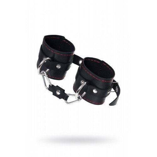 Однослойные кожаные наручники с контрастной строчкой красного цвета могут стать стильным аксессуаром на «свободных» руках, но могут послужить вашим целям и фантазиям по своему прямому назначению. Наличие двух карабинов и колец позволяет использовать изделие как раздельно – аксессуар-манжеты, так и как наручники для фиксации. К широким металлическим кольцам также можно присоединить и другие аксессуары при помощи карабинов. Благодаря универсальному размеру наручники могут использоваться и мужчинами, и женщинами. Размер легко регулируется с помощью металлических пряжек, органично вписывающихся в общий стиль. Материал: натуральная кожа. Цвет черный. Размер: ширина манжет  6,5 см, длина манжет 20 см, длина сцепки 11 см.