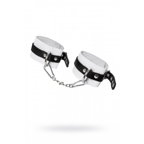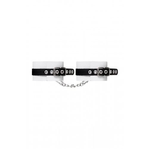 Мягкие оковы с  жёсткими ремешками от Pecado помогут обездвижить партнера во время сексуальных прелюдий или жестких БДСМ-играх. Наручники изготовлены полностью из белой, натуральной кожи. Ремешки выполнены из чёрной жёсткой кожи, украшены люверсами. Выделка материала произведена вручную. Ремешки и широкая манжета хорошо держат форму: не тянутся и не мнутся. Качественная металлическая фурнитура добавляет лоска изделию, а аромат натуральной кожи повышает градус возбуждения. Благодаря широкому запасу регулировок, можно подобрать необходимый обхват. Аксессуар удобно застегивать и легко расстегивать. При правильном использовании не оставляет следов на теле и не доставляет дискомфорта. Манжеты оков соединяется между собой помощью двух карабинов и съемной стальной цепочки. Подходит и для женских, и для мужских ног. Ширина манжет - 5,5см Длина манжет - 25см Длина сцепки - 24см.