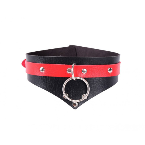 Оригинальный ошейник в стильном красно-черном исполнении. БДСМ-атрибут используют в откровенных властных играх. Стильный ошейник выполнен из мягкой искусственной кожи. Украшен модными заклепками и имеет кольцо для поводкаи других аксессуаров. БДСМ-атрибут регулируется при помощи застежки. Размер: длина: 52 см, ширина 4 см, максимальная ширина 7,5 см. Цвет: черный.