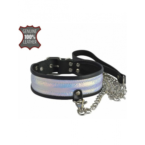 Фантастически яркий, эффектный и безумно сексуальный ошейник от Ситабелла привнесет в Ваши эротические отношения фейерверк незабываемых ощущений. Если любите подчинятся, так делайте это красиво и с шиком! Натуральная черная кожа, из которой изготовлен ошейник, декорирована голографической вставкой, преобладающим цветом которой, является перламутр. При различном освещении и смене декораций будет меняться цвет ошейника, отражая пространство. Эта завораживающая смена цветов отразится страстным влечением партнёра и незабываемыми ощущениями. Легко зафиксировать девайс на шее и отрегулировать размер можно при помощи пряжки. Торцы ошейника отделаны оторочкой, что придает краю скругленный вид. Для управления секс-партнёром к ошейнику, при помощи карабина, крепится поводок-цепочка. Для удобного использования, на поводке имеется кожаный ремешок-петля для запястья. Размер: ширина ошейника 4,5 см, длина 45 см, общая длина поводка около 1 м.