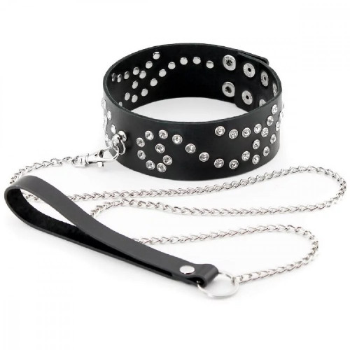 Ошейник БДСМ с поводком — это стильный и качественный аксессуар для любителей интимных ролевых игр. Кожа, из которой сделан ошейник, крепкая и не деформируется, но при этом она эластичная и приятная к телу. Ошейник украшен блестящими стразами по всей длине, а цепочка на поводке выполнена из надёжной стали. Размер можно регулировать от 31 до 38 см. Ошейник можно отстегнуть от цепочки и использовать отдельно. Он прост в применении и уходе. Несмотря на свою принадлежность к интимным аксессуарам, его можно без стеснения носить на вечеринке или фотосессии. Ошейник с металлическим поводком — отличное дополнение к сексуальному костюму. Он поможет вам освежить свою сексуальную жизнь и попробовать что-то новое и захватывающее. А качество натуральной кожи гарантирует нежность и комфорт при ношении, обеспечивая при этом безупречное ощущение удовольствия и подчинения. Размер: ширина ошейника 4,2 см, длина 42 см, длина поводка с цепочкой 65 см. Ошейник изготовлен из натуральной кожи. Цвет черный.