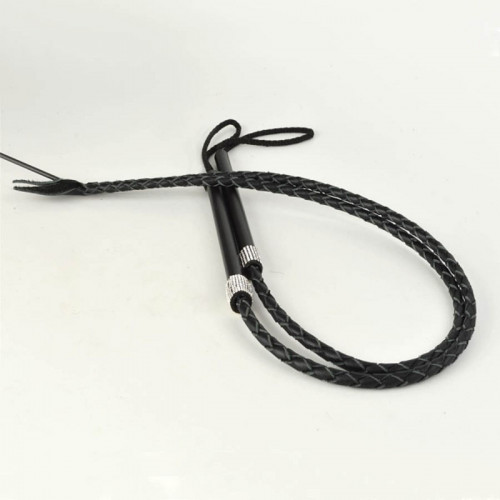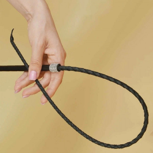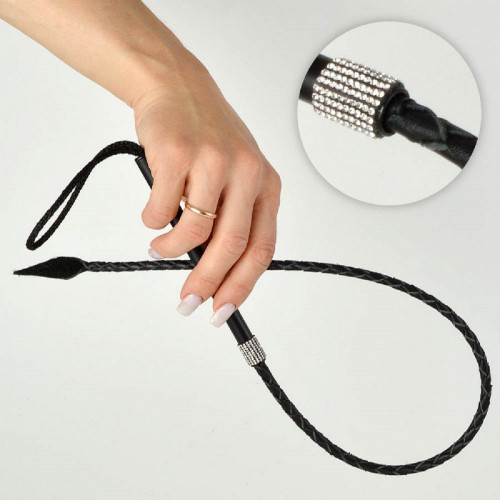 Плетеный хвост изготовлен из натуральной черной кожи, внутри имеется гибкое упругое основание. Рукоять металлическая, окрашена в черный цвет и декорирована стразами. Общая длина изделия составляет 65 см. Длина рукояти 14 см. Цвет черный.