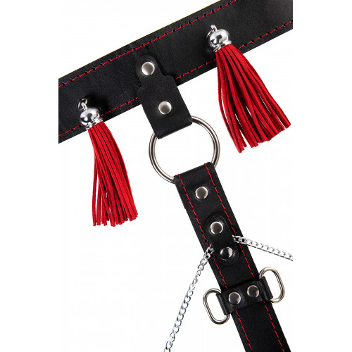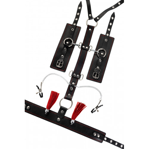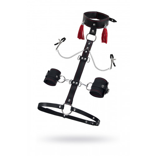 Бандажная система для фиксации рук и шеи с зажимами для сосков состоит из ошейника с кисточками, пары наручников для рук и зажимов для сосков, всё это в фирменной деревянной коробке. Кожаный ошейник соединяется с наручниками с помощью кольца и металлических карабинов. Фиксаторы для рук крепятся к кольцу металлическими цепочками с карабином. Кольцо на ошейнике позволит присоединить и другие аксессуары при помощи карабинов и экспериментировать с позициями и ощущениями. С этим комплектом расширить возможности и способы фиксации проще простого! Варианты и комбинации ограничения свободы партнера зависят от вашей фантазии и желаний. Частичное обездвиживание и невозможность двигать руками дают вам полную власть над партнером – взрослые игры для взрослых.