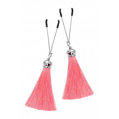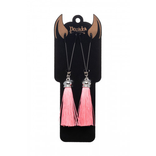 Попробуйте новые, дерзкие ощущения глубокого наслаждения! Зажимы-вилки от Pecado гарантируют смешение ярких чувств от тактильного контакта с нежной кожей сосков. Зажимы выполнены из высококачественных материалов. Металлическая часть компактная, приятная на ощупь. На концах черные резиновые наконечники, для безопасного воздействия на эрогенные зоны. Интенсивность сжатия аксессуара регулируется миниатюрными колечками. В зависимости от личных предпочтений и сценария игры, можно выбрать легкое пощипывание, или сильное сдавливание. Бахрома из натурального шелка, в насыщенном озовом цвете, добавляет манящую красоту смелому атрибуту. При каждом соблазнительном покачивании груди, кисточки движутся в пикантном ритме. Также подходит для стимуляции и возбуждении в области половых губ и клитора.