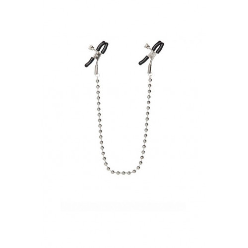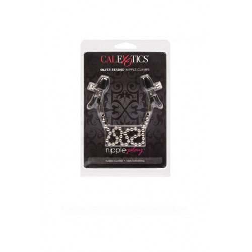 Зажимы на соски Nipple Clamps Silver Beaded соединенные между собой цепью. Сила сжатия сосков легко регулируется. Размеры: длина зажима с цепью 41 см, диаметр каждого заима 5 см. Цвет: серебряный. Вес изделия: 0,07 (кг). Материал: металл, ABS-Plastic.
