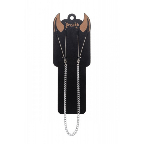 Зажимы-вилки от Pecado гарантируют смешение ярких чувств от тактильного контакта с нежной кожей сосков. Зажимы выполнены из высококачественного металла. Интенсивность сжатия аксессуара регулируется миниатюрными колечками. В зависимости от личных предпочтений и сценария игры, можно выбрать легкое пощипывание, или сильное сдавливание. Также подходит для стимуляции и возбуждении в области половых губ и клитора. Общая длина зажимов 7 см, длина цепочки 31 см. Не требуют специального ухода.