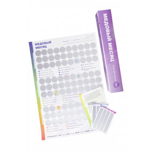 Эротическая игра для двоих Медовый месяц – настоящая карта-путеводитель в сексуальных приключениях! Такая игра гарантированно разнообразит интимную жизнь в паре. Карта не только разжигает страсть, но и становится своеобразным учебным пособием, а как известно – учиться в игровой форме намного эффективнее и приятнее. Специальный скретч-плакат содержит 90 эротических поз, 3 уровня сложности и 32 бонусных задания. Выполняйте задания и набирайте максимальное количество баллов, чтобы пройти путь от новичков к профессионалам. Азартная игра позволяет каждому участнику открывать для себя новые грани удовольствий и демонстрировать способности. Игра способна пощекотать нервы, ведь все позы скрыты защитным слоем, а общий результат зависит от вклада каждого участника. Если считаете себя продвинутым игроком, начинайте сразу с третьего уровня. Или продвигайтесь по карте постепенно, создавая свой неповторимый индивидуальный путь.