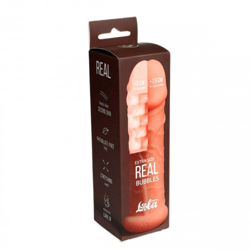 Насадка для пениса The Real Extra Size сделает пенис длиннее на 3 см благодаря встроенному удлинителю и диаметр больше на 1,5 см. А двусторонний яркий рельеф насадки - реалистичный снаружи и с пузырьками внутри - добавит стимуляции обоим партнерам одновременно во время полового акта! Насадка изготовлена из нежного материала, который будет ощущаться как вторая кожа. Фиксирующее кольцо очень мягкое и отлично растягивается, позволяя надежно закрепить насадку под мошонкой предотвращая её спадание. Не использовать вместо презерватива. Внутренний диаметр - 3,5 см.