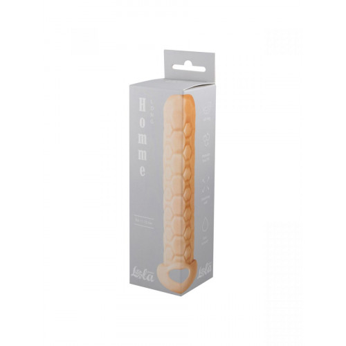 Насадка Long коллекции Homme обеспечивает увеличение размера пениса в длину. Материал насадки - гипоаллергенный, создающий имитацию мягкой и шелковистой «кожи» ТПЕ. Фиксирующее кольцо на мошонку не только удерживает фаллоудлинитель, но и благодаря сдавливанию может усиливать эрекцию. Двухсторонний нереалистичный рельеф насадки позволит одновременно стимулировать сразу обоих партнеров во время полового акта и дополнительно подарит приятные ощущения. Насадка оснащена встроенным удлинителем. Насадка отлично тянется, продлевает время интимной близости и компенсирует анатомическое несоответствие между партнерами. Длина полости - 12,5 см., диаметр - 2,8 см.