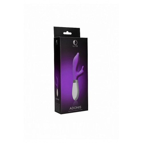 Adonis – вибромасссажер кролик. Эта игрушка имеет особую эргономичную форму с маленьким округлым выступающим кончиком, и гибкий клиторальный отросток с усиками, что делает стимуляцию более концентриованной. Вибромассажер имеет два мощных двигателя, по одному в каждом отростке, обеспечивающих 10 функций вибрации, способной достигать 7000 оборотов в минуту, при этом уровень звука не превышает 50 дБ. Игрушка изготовлена из высококачественного силикона и АБС-пластика. Батарейки: 2 AAA (не входят в комплект). Размер: общая длина 21.8 см, рабочая длина 12.5 см, длина клиторального отростка 4,5 см, диаметр 3,5 см. Цвет фиолетовый.  Для более комфортного использования рекомендуем приобрести смазку на водной основе и очищающий спрей Clear Toy 100 мл для обработки изделия.