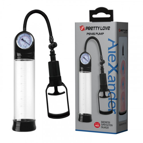 Вакуумная помпа для мужчин прозрачного цвета. Помпа снабжена удобным рычагом для создания вакуума и встроенным манометром для контроля степени разряжения воздуха. Эластичный уплотнитель помогает увеличить поверхность соприкосновение помпы с кожей. Длина колбы - 29 см.
