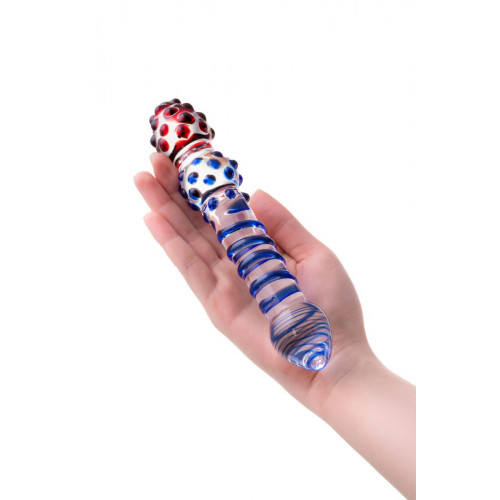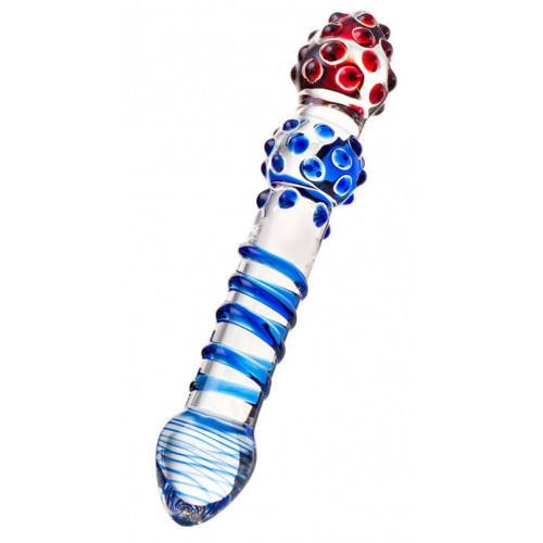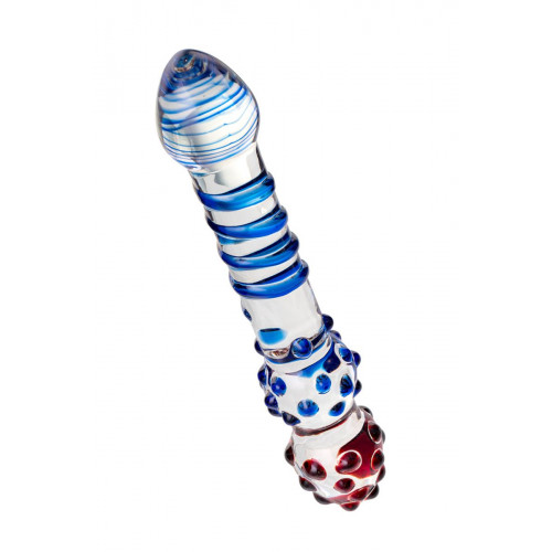 Популярная модель стеклянных игрушек - двойной фаллос с ограничительным основанием по середине. Одна половинка - небольшой прозрачный фаллос с круглой головкой и объемными цветными массажными точками, вторая часть - с гладкой головкой и объемной спиралью. Весь фаллос окрашен вручную, гипоаллергенен и безопасен. Минимальный диаметр - 2,7 см.