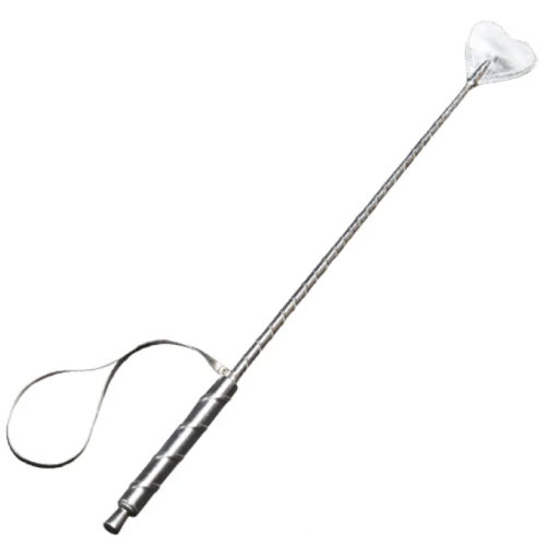 Стек с хлопалкой на конце, в виде небольшого сердечка, оставят на теле секс-партнёра следы пламенной страсти и возбуждения. Стек оплетён искусственной кожей цвета металлик, под золото. Внутри рукояти, деревянная основа, что обеспечивает комфортное удерживание в руке. Также для удобного использования, имеется ремешок, при помощи которого аксессуар можно носить на запястье, что даёт возможность освободить руки. Полимерный хлыст, на котором размещено сердечко, гибкий, но упругий. Общая длина стека составляет 57 см, длина рукояти 13 см, длина хлопушки 7 см, ширина хлопушки 6 см. Цвет серебро.