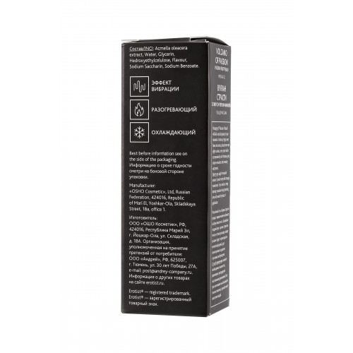 Массажный гель «Вулкан страсти» придаст вашим моментам близости особую пикантность. Волшебный сладкий вкус и аромат, приятное тепло и лёгкая прохлада, каждое касание будет сопровождаться мягкой вибрацией, даря неповторимые ощущения и усиливая возбуждение. Нанесите немного жидкого геля на интимные зоны, и через несколько секунд вы почувствуете тепло, затем в течение 2-3 минут легкую вибрацию и легкий холодок. Длительность эффекта зависит от особенностей вашего организма. Гель с вибрирующим эффектом для интимных зон на основе натуральных ингредиентов, без парабенов. Вкус и аромат персик-маракуйя. Подходит для поцелуев и орального секса.