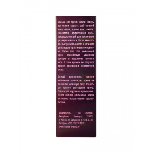 Больше нет причин ждать! Теперь вы можете сделать свой половой член таким, каким вам хочется. Невероятно эффективный крем, предназначенный для увеличения размеров фаллоса. Легко наносится, быстро впитывается и начинает действовать практически мгновенно. Кроме того, этот уникальный крем способствует усилению эрекции и продлению полового акта. С этим кремом вы получите оргазм совершенно невероятной силы.