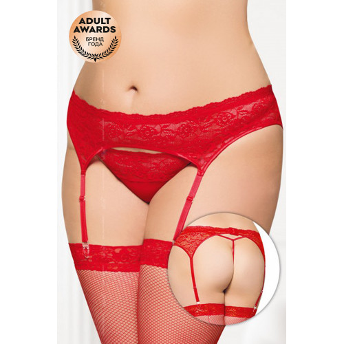 Комплект: пояс для чулок и стринги закрытые. Пояс выполнен из кружевного материала с цветочным арнаментом. Стринги из комбинированного материала: кружево (верхняя часть) и более плотная не прозрачная ткань (нижняя часть стрингов).