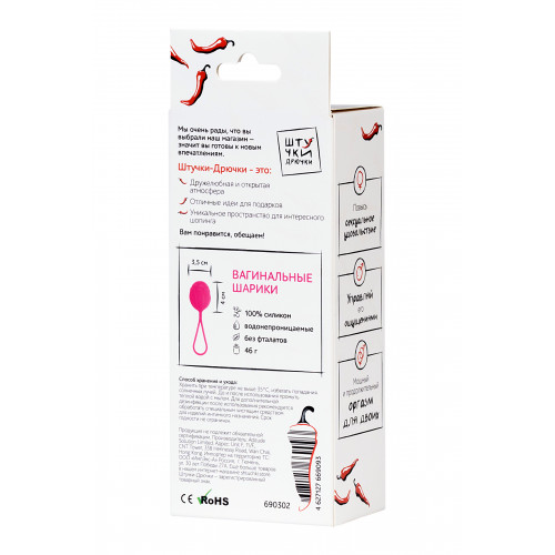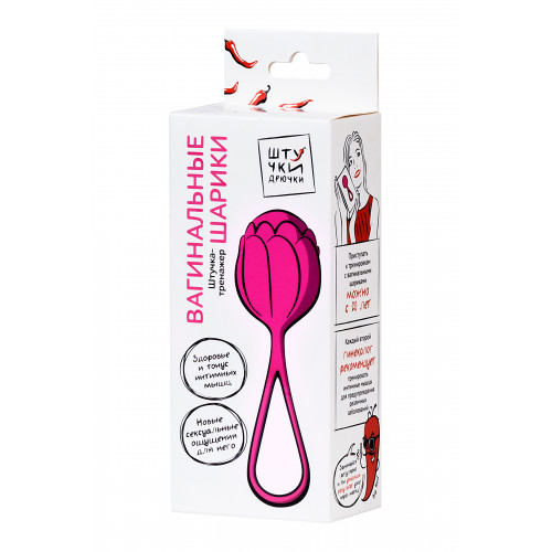 Я - вагинальный шарик «Штучки-Дрючки», лучший тренажер для интимных мышц. Я полностью состою из медицинского силикона, поэтому тренироваться со мной не только удобно, но и безопасно. У меня смещен центр тяжести, что позволяет проводить тренировки с большей эффективностью. Я легко составлю тебе компанию дома во время уборки и даже в офисе во время скучного совещания. Всего за пару месяцев ты укрепишь интимные мышцы и сделаешь их более упругими, а в качестве бонуса получишь умопомрачительный секс и огромное количество оргазмов. Для более комфортного использования рекомендуем приобрести специальный гель для вумбилдинга (фитнеса интимных мышц) Intim Fitness для женщин 50 гр и очищающий спрей Clear Toy 100 мл.