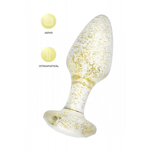 Анальная втулка классической формы выполнена из акрила. Прозрачный материал с золотистыми блестками внутри. Ограничительное основание обеспечивает безопасность при использовании, поэтому втулку высоко ценят не только опытные любители анального секса, но и новички. Размер: общая длина 8 см, рабочая длина 6,5 см, диаметр 2,8 см. Для более комфортного использования рекомендуем приобрести смазку на водной основе и очищающий спрей Clear Toy 100 мл для обработки изделия.