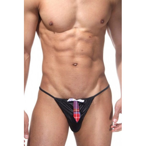 Стринги черного цвета для мужчин, на тоненьких, хорошо тянущихся резинках. Спереди декор - небольшой клетчатый галстук.