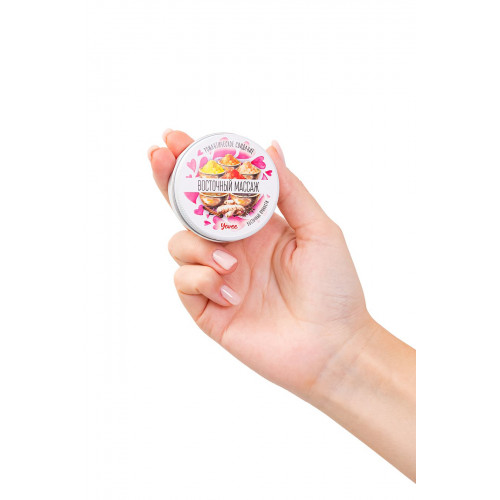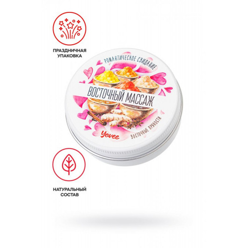 Массажная свеча Yovee «Восточный массаж» c ароматом «Восточные пряности» - изысканный аксессуар для романтического свидания. Изготовлена из натуральных масел, которые питают, увлажняют, смягчают кожу и делают её шелковистой. Ненавязчивый сладкий аромат восточных пряностей остается легким шлейфом, напоминая о проведенных минутах блаженства. Благодаря праздничному дизайну упаковки свеча отлично подходит в качестве презента. Основа свечи - гидрогенизированное соевое масло, которое идеально смешивается с уходовыми маслами и отдушкой, а при комнатной температуре приобретает плотность воска. При горении свечи твердый воск расплавляется в тёплое массажное масло, не обжигающее кожу. Уходовые масла: пальмовое, кокосовое и масло виноградной косточки - многофункциональны. Пальмовое масло помогает справиться с авитаминозом кожи, дарит приятное увлажнение и свежесть, смягчает огрубевшую и шелушащуюся кожу, помогает справиться с возрастными изменениями. Кокосовое масло придает коже бархатистость, защищает и смягчает.