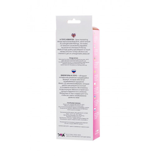Вибратор A-Toys обладает интересным дизайном и выдающейся формой, которые обеспечат незабываемые ощущения. Имеют 20 режимов вибрации, которые удобно регулируются кнопкой в основании игрушки. Изготовлены из высококачественного и приятного на ощупь бархатистого силикона. Вибратор A-Toys созданы для того, чтобы доставить незабываемое удовольствие! Рабочая длина - 14 см.