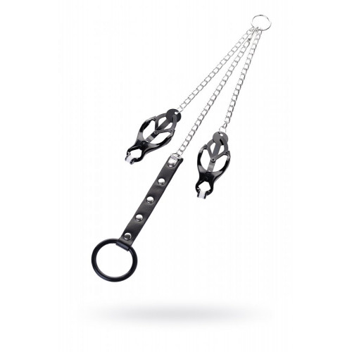 Мужская версия зажимов для воздействия на соски. Конструкция с пружинным механизмов - один из самых жестких вариантов. Дополнительное ограничение свободы обеспечивает мягкое кольцо на пенис. Длина зажимов 9 см, внутренний диаметр кольца 3,5 см.