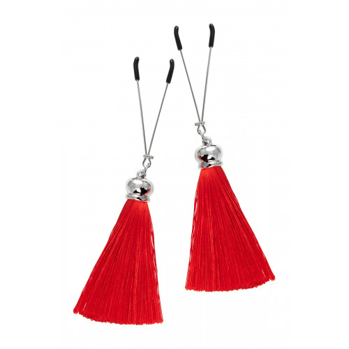 Попробуйте новые, дерзкие ощущения глубокого наслаждения! Зажимы-вилки от Pecado гарантируют смешение ярких чувств от тактильного контакта с нежной кожей сосков. Зажимы выполнены из высококачественных материалов. Металлическая часть компактная, приятная на ощупь. На концах черные резиновые наконечники, для безопасного воздействия на эрогенные зоны. Интенсивность сжатия аксессуара регулируется миниатюрными колечками. В зависимости от личных предпочтений и сценария игры, можно выбрать легкое пощипывание, или сильное сдавливание. Бахрома из натурального шелка, в насыщенном красном цвете, добавляет манящую красоту смелому атрибуту. При каждом соблазнительном покачивании груди, кисточки движутся в пикантном ритме. Также подходит для стимуляции и возбуждении в области половых губ и клитора.