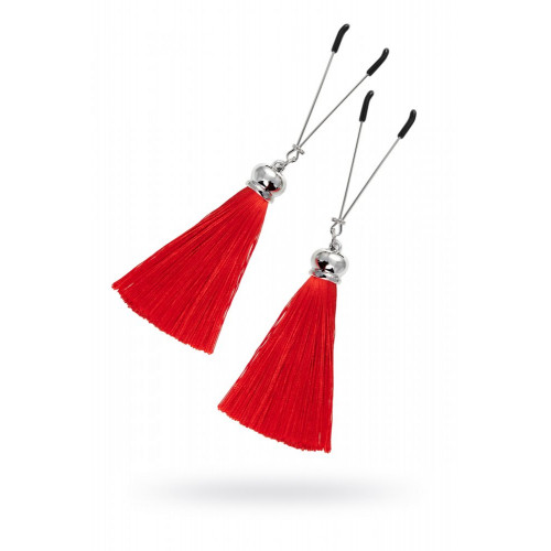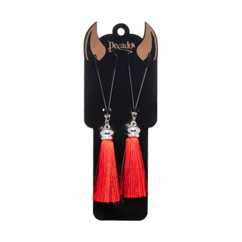 Попробуйте новые, дерзкие ощущения глубокого наслаждения! Зажимы-вилки от Pecado гарантируют смешение ярких чувств от тактильного контакта с нежной кожей сосков. Зажимы выполнены из высококачественных материалов. Металлическая часть компактная, приятная на ощупь. На концах черные резиновые наконечники, для безопасного воздействия на эрогенные зоны. Интенсивность сжатия аксессуара регулируется миниатюрными колечками. В зависимости от личных предпочтений и сценария игры, можно выбрать легкое пощипывание, или сильное сдавливание. Бахрома из натурального шелка, в насыщенном красном цвете, добавляет манящую красоту смелому атрибуту. При каждом соблазнительном покачивании груди, кисточки движутся в пикантном ритме. Также подходит для стимуляции и возбуждении в области половых губ и клитора. Ручная работа. Надежная высококачественная фурнитура. 100% натуральный шелк. Размер: общая длина зажимов 14 см, длина кисточки 8,5 см. Не требуют специального ухода.