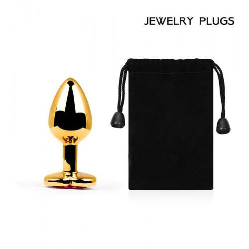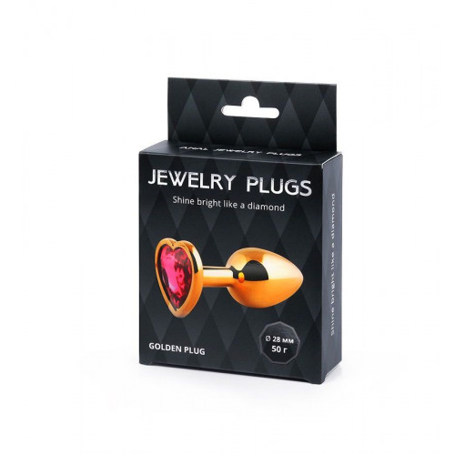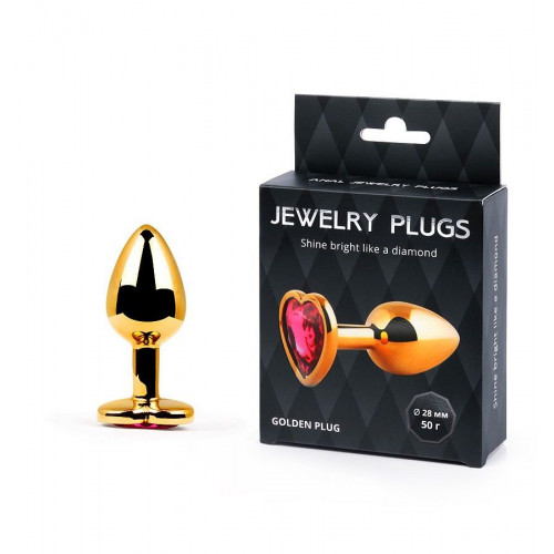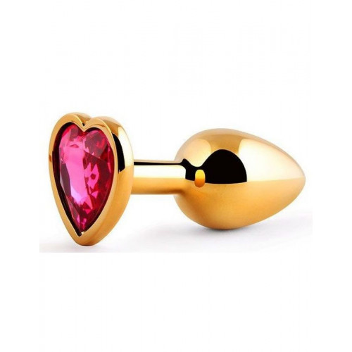 Золотистая анальная пробка с малиновым кристаллом-сердечком - 7 см.